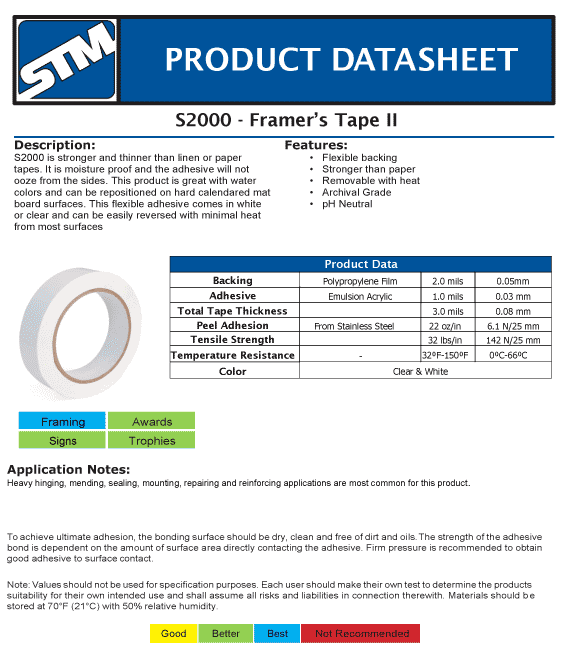 This Framer's Tape II is a specialized, acid-free, solvent-free, archival and yet, highly versatile, picture framing tape. Made from Mylar, it is flexible, moisture-proof, tough and stronger than linen, Kraft, gummed, or other paper tapes. It is stable, reliable and lasting, with non-porous film backing, possessing excellent anti-aging properties. The tape is Acid-free, Archival Grade, PH-Neutral and eminently suitable for hinging art on paper, watercolours, etchings, lithographs, serigraphs, Limited Editions, documents, etc. Additionally, it can be used for mending, repairing, bonding other art, books and making folders or custom solander boxes. It enables picture framers, artists, photographers, restorers and other art users to achieve a neat, clean, durable professional finish and result, especially when mounting and matting mounting artwork. Additional conservation, preservation and bookbinding applications include restoration, hinging, mending reinforcing and joining of papers, pages repositioning and repairs to damaged edges. Physically, it is white, thin and flexible, yet very strong and engineered for picture framing applications. To achieve optimal adhesion, the bonding surface should be dry, clean and free of dirt, residues and oils. The strength of the adhesive bond is dependent on the amount of surface area directly contacting the adhesive. Firm pressure, or burnishing, is recommended to obtain good adhesive and maximize surface contact. Once applied, and if required, this Framer's Tape II Archival may be gently removed with a little heat and leaving previously adhered surfaces without tears. Subject to being in stock, order online here and now for prompt dispatch and ( where applicable ) delivery throughout Australia, including Melbourne, Adelaide, Perth, Darwin, Brisbane, Sydney, Canberra, Hobart, the Gold Coast and Brisbane!