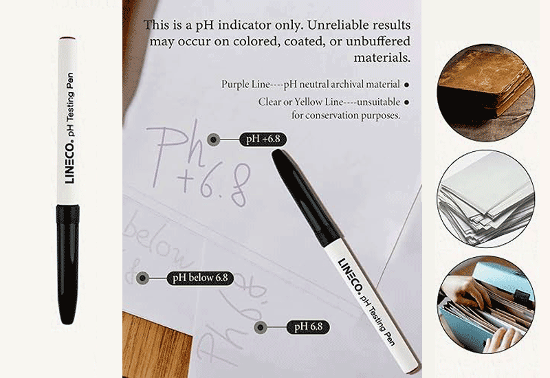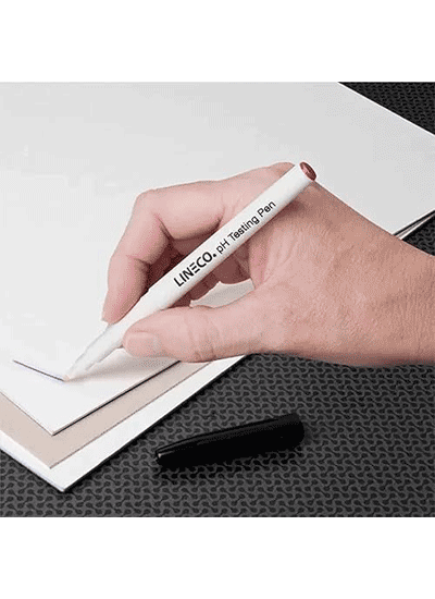 The famous, Lineco Ph Testing Pen is a quick, inexpensive and easy-to-use archival tool. It is designed to check if letters, cards, books, diaries, documents, folios, papers, boards or other paper-based materials are acidic (unsuitable for storage) or alkaline/neutral (safe for conservation).